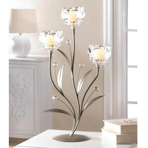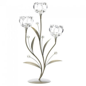 This beautiful crystal candle holder adds to any décor. The metal stems and leaves gives the look of a flower in bloom. When lit, the reflects beautifully through the crystal. Use tea light or flameless candles.